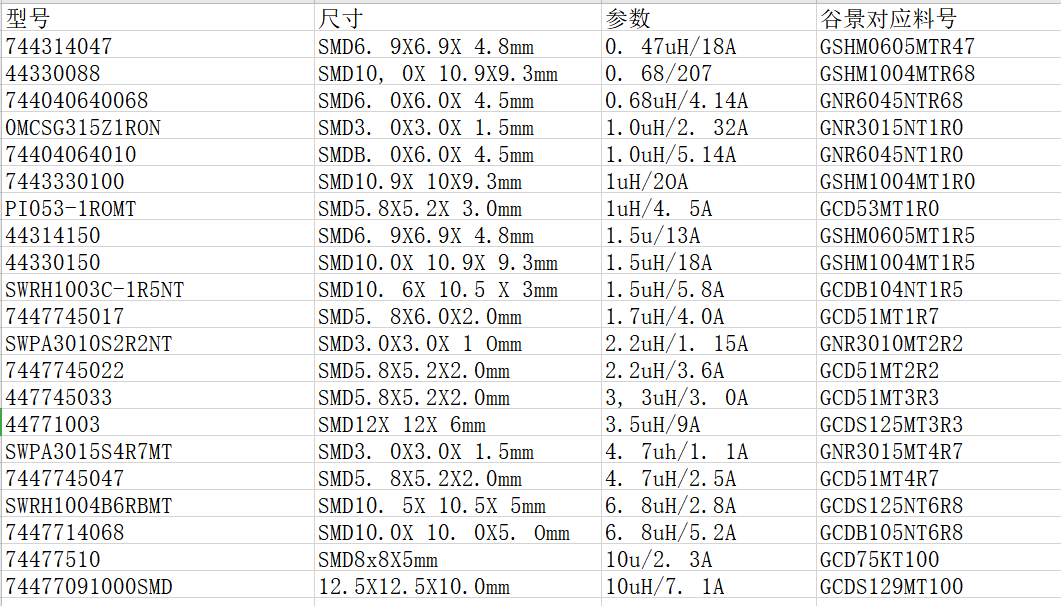 谷景貼片電感替代伍爾特貼片電感的部分合集